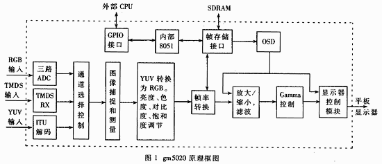 gm5020是加拿大genesis公司为液晶显示器(LCD)和其它点阵显示器生产的高度集成的图像处理芯片,具有以下主要的特征: